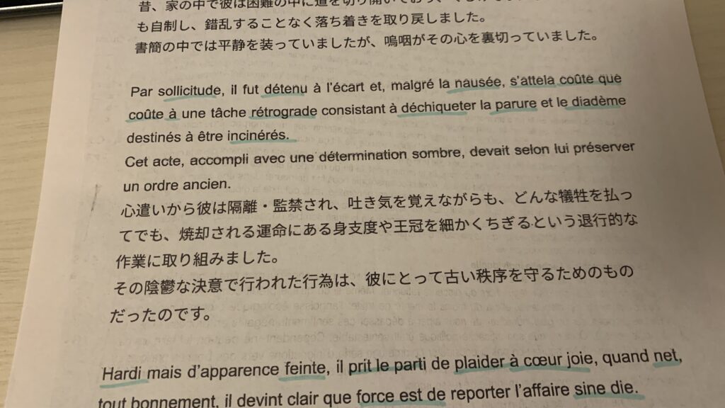 「焼却される運命にある身支度を細かくちぎる」って意味が分からない。でもいいんです。むしろその方が印象に残るし、文章に入っているということが重要に思います。(覚えたい単語によってはもうちょっと自然な文章ができあがる気もします) もちろん自分で作るには越したことはないですが、「準備が簡単!」が今回の検証の大事なポイントだったのでAI頼りです。作ってもらった2文×10セットのフランス語と日本語訳を印刷して、覚えたい単語にマーカーで色をつけて、それを毎晩音読しました。①と違って手を使わないので楽ちんです。